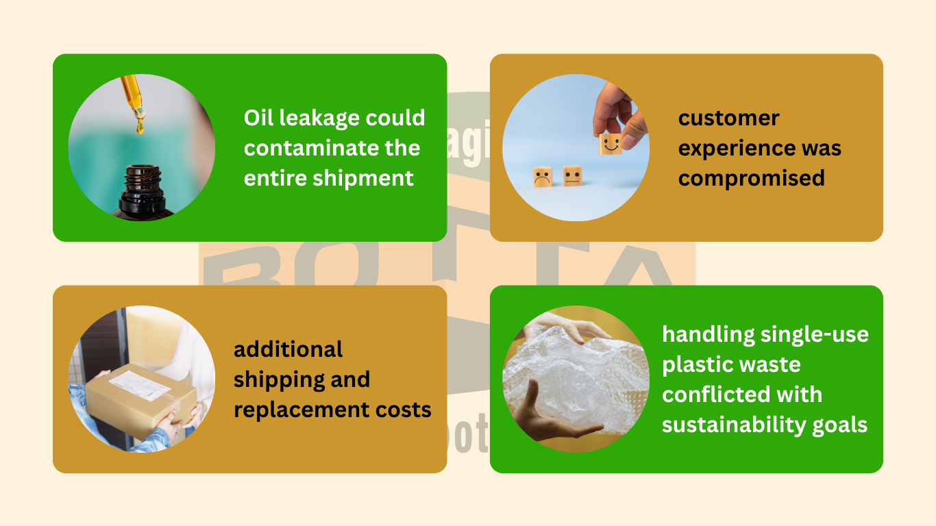 Their current packaging relied heavily on single-use plastic materials — primarily bubble wrap and plastic tape — placed inside a large 12-bottle cardboard base.