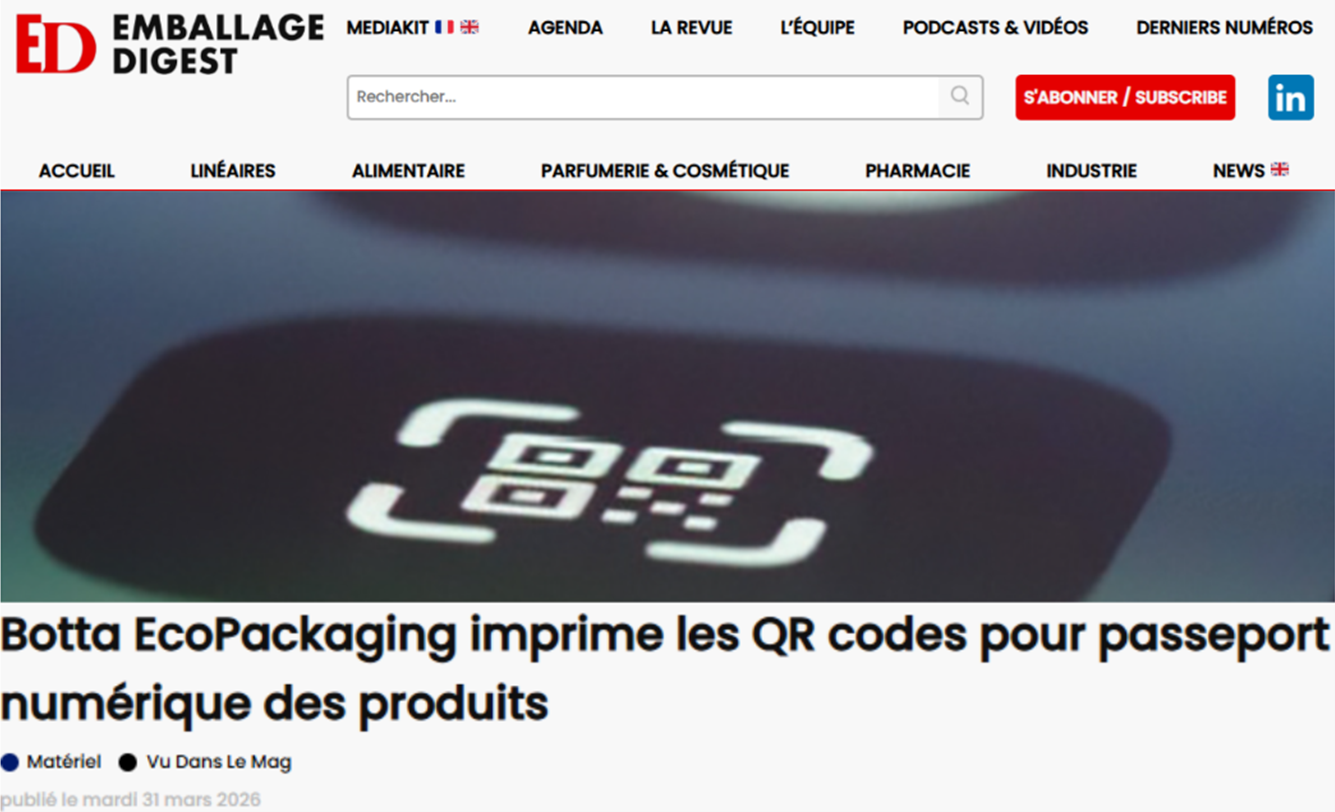 BOTTA EcoPackaging est fière de figurer dans le numéro de mars 2026 d’Emballage Digest, l’un des principaux médias français du packaging. L’article met en lumière le rôle de iQRcode™ en tant que solution de packaging code QR transparente et durable, conçue pour soutenir la conformité aux futures réglementations européennes, notamment le Passeport numérique des produits (DPP) et la transition GS1 Sunrise 2027.